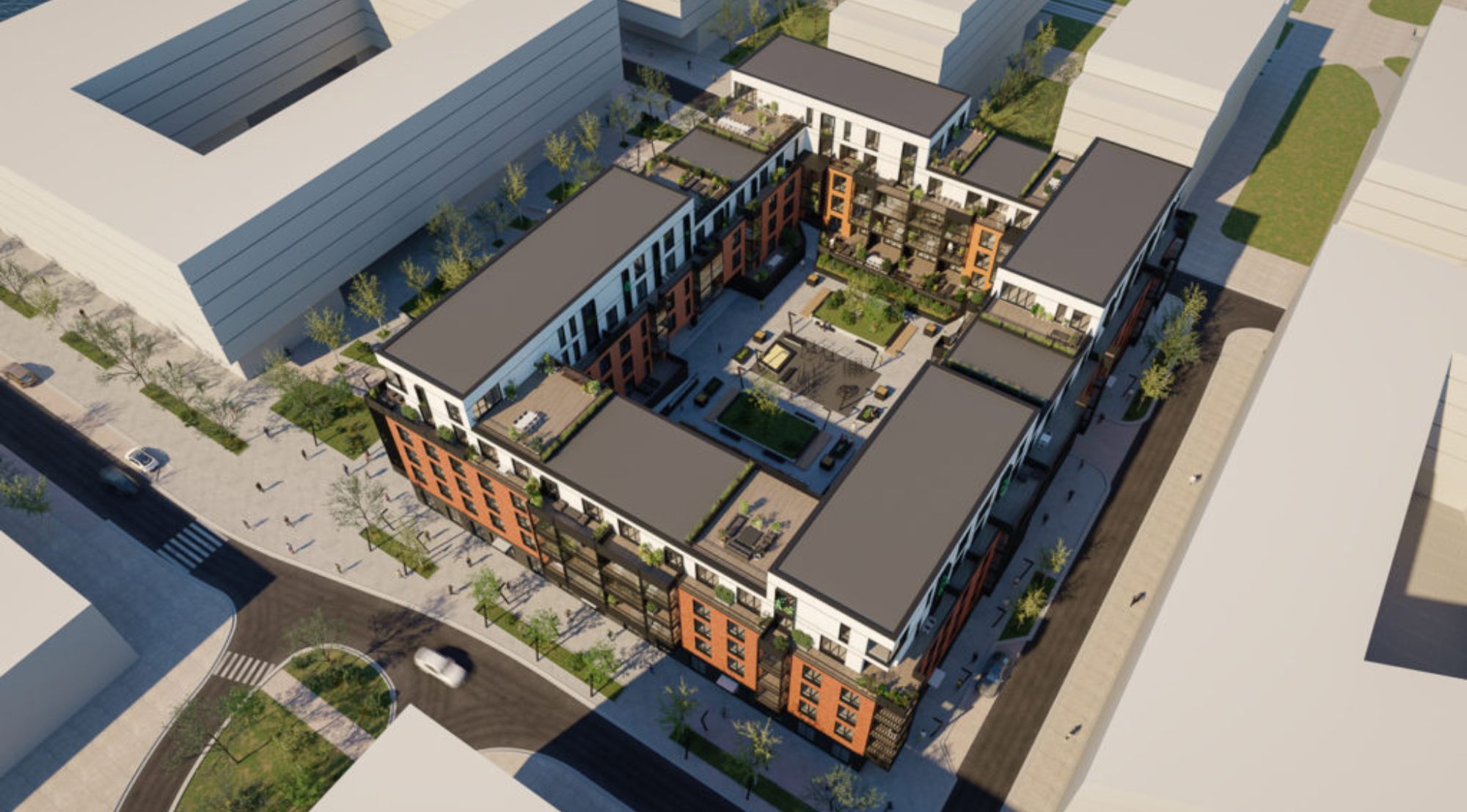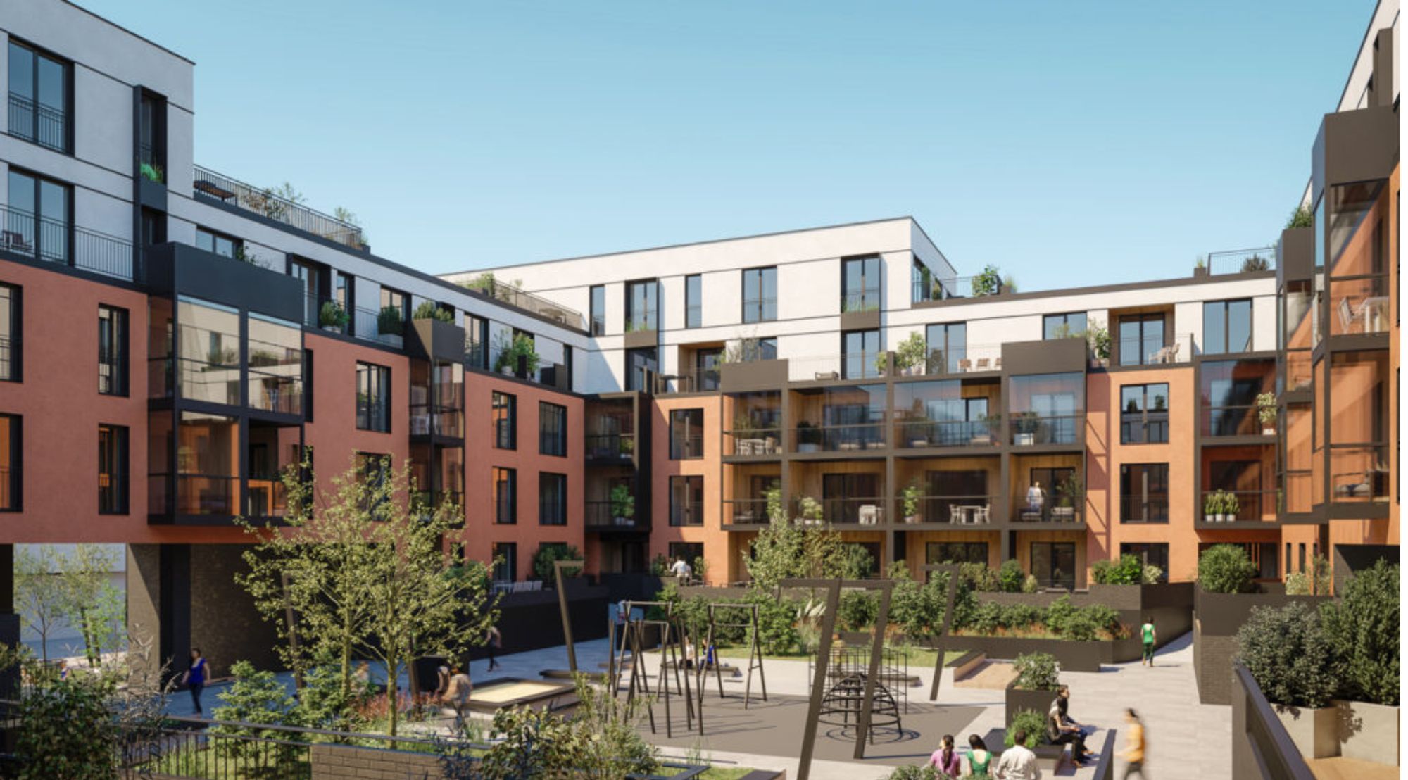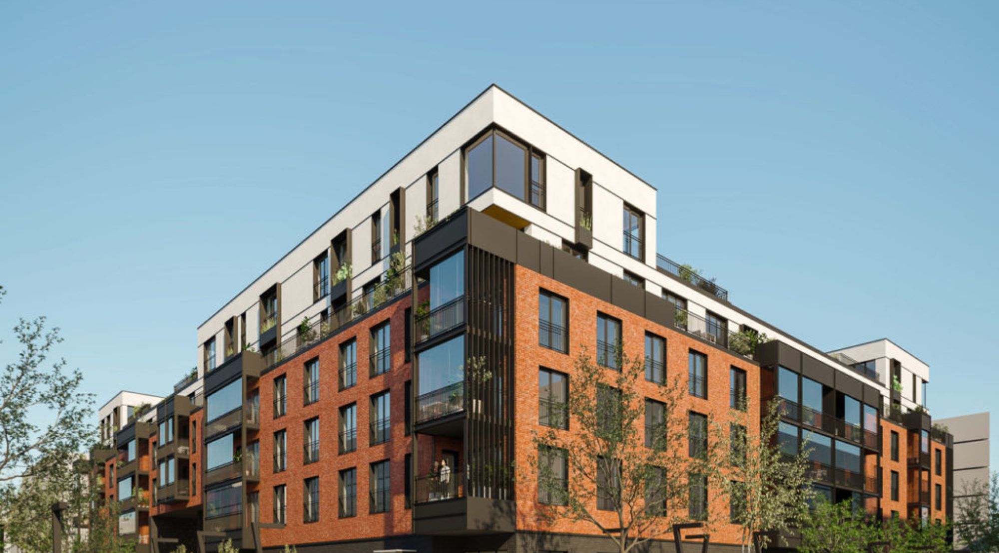 Punakas telliskivisaade domineerib hoone alaosades, andes kompleksile sooja ja kodutruu ilme. See materjal loob tugeva sideme Noblessneri ajaloolise tööstuspärandiga, austades piirkonna mineviku samal ajal kaasaegset nägu luues. Valged ja helehallid fassaadiplaadid ülemistes osades tasakaalustavad punakat tonaalsust, andes kompleksile kergemuse ja modernse ilme. See kontrastne materjalide kasutus loob visuaalset rütmi ja aitab struktureerida hoonete mahtu. Sisehoovis paiknev laste mänguväljak ja haljastatud puhkealad tagavad kõrgekvaliteedilise kogukonnakeskkonna. See lähenemisviis toetab kogukondlikku elu ja suurendab elanike elukvaliteeti.