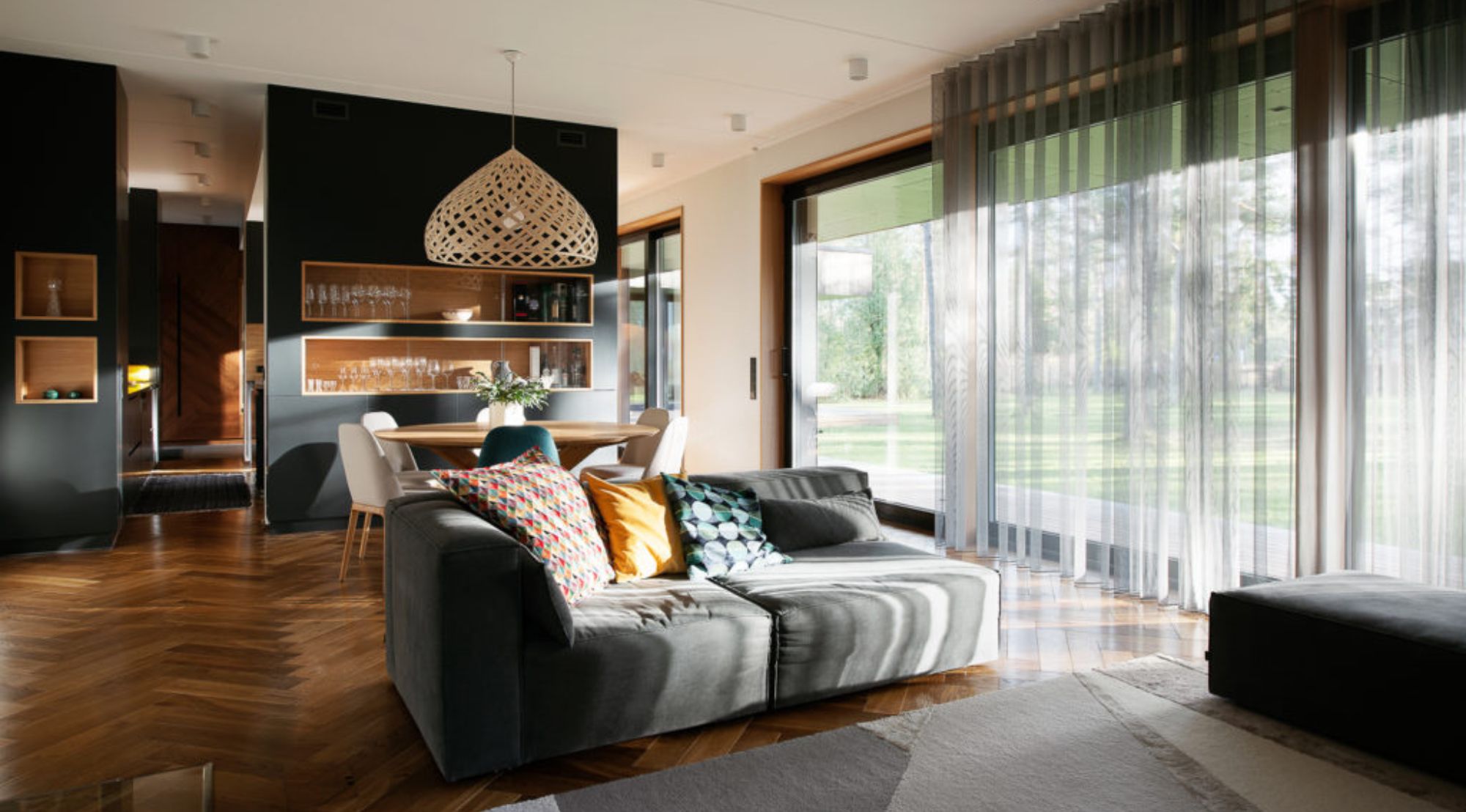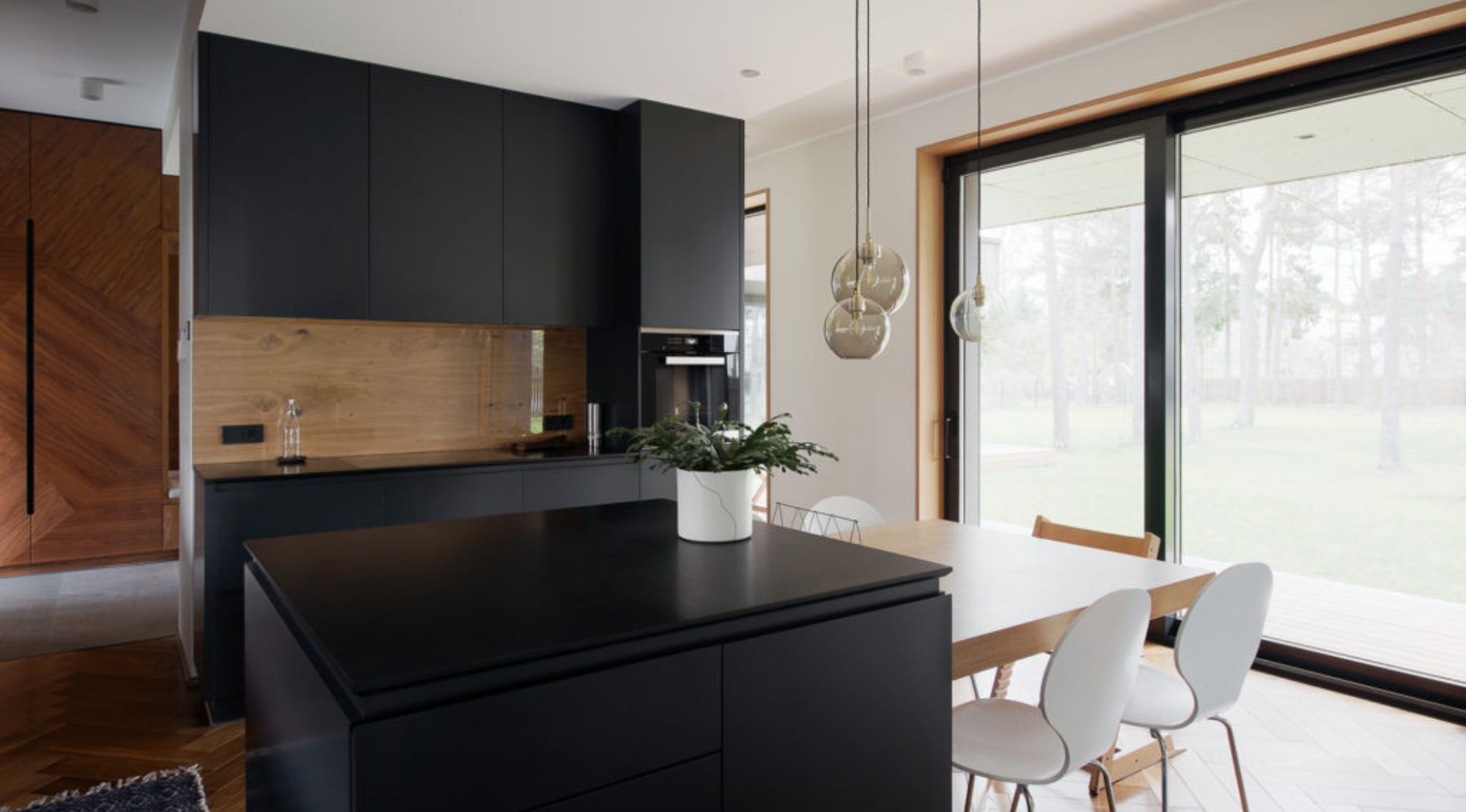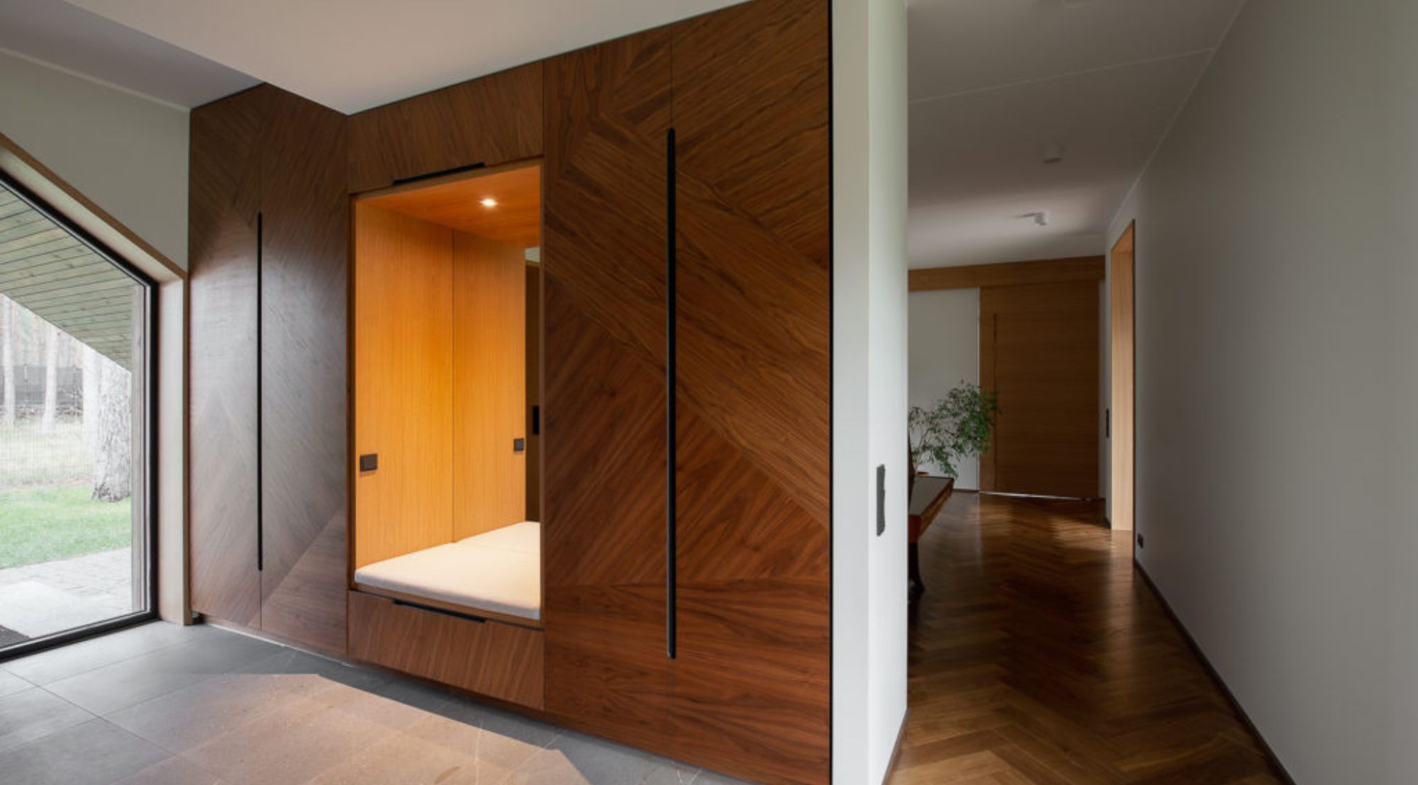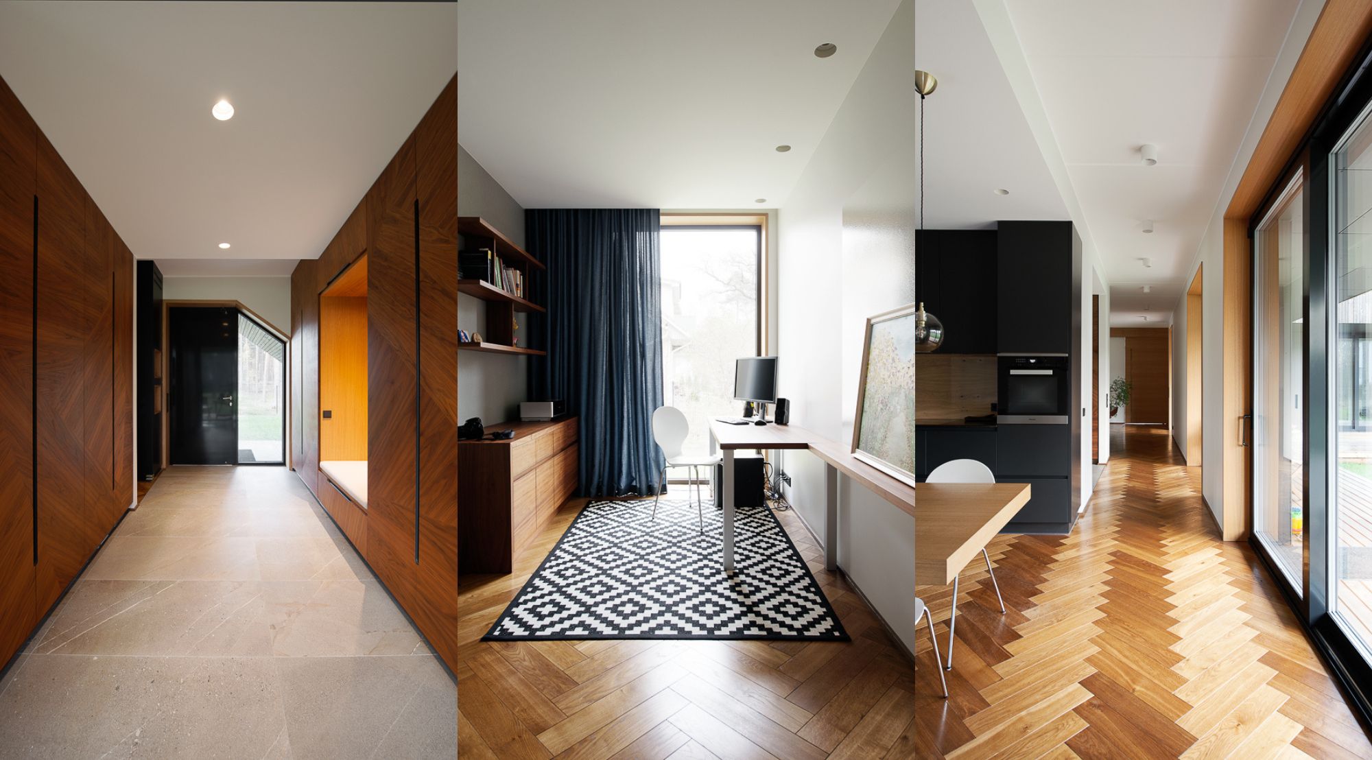 Nõmme eramaja sisearhitektuur demonstreerib oskuslikku tasakaalu looduslike materjalide soojuse ja kaasaegse minimalismi vahel. Ruumilahenduses domineerib puidukasutus, mis loob orgaanilise sideme hoone välisilme ja sisekeskkonna vahel. Tumepruun puit köögisaalis ja vannitoas ning helekollased kivid põrandapindades ja sisustuselementides loovad kihistunud ja rikka tekstuuride maailma. Sisearhitektuuri üldine lähenemisviis järgib “less is more” põhimõtet, kus iga element on hoolikalt valitud ning täidab nii esteetilist kui ka funktsionaalset rolli. See loob kodu, mis on ajatu, mugav ja harmoonias ümbritseva looduskeskkonnaga.