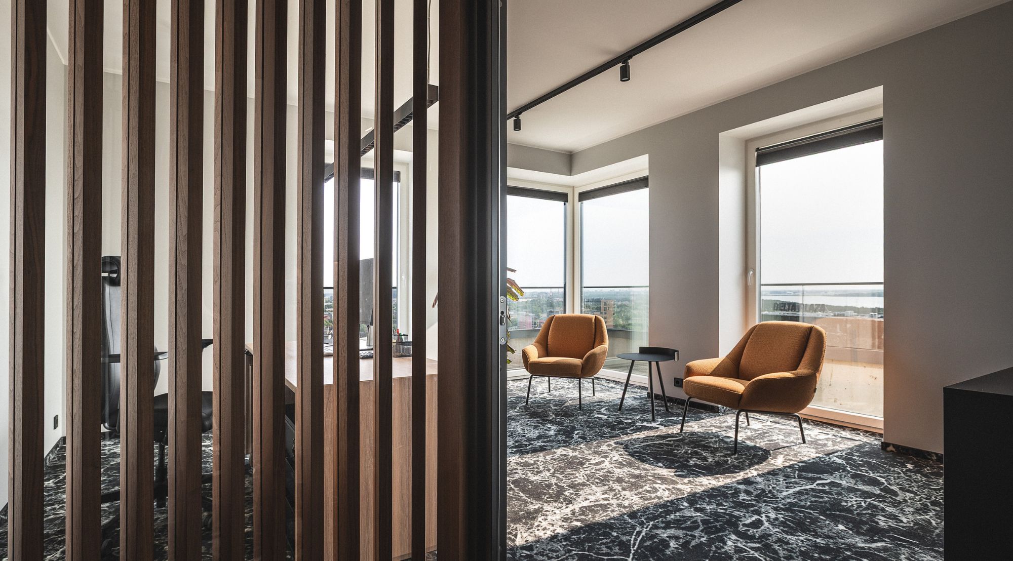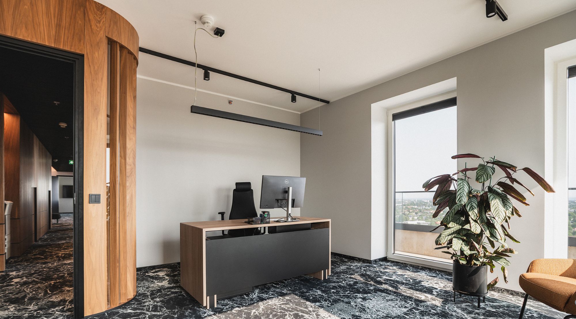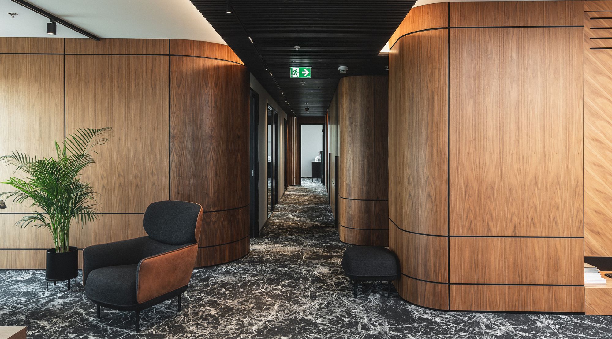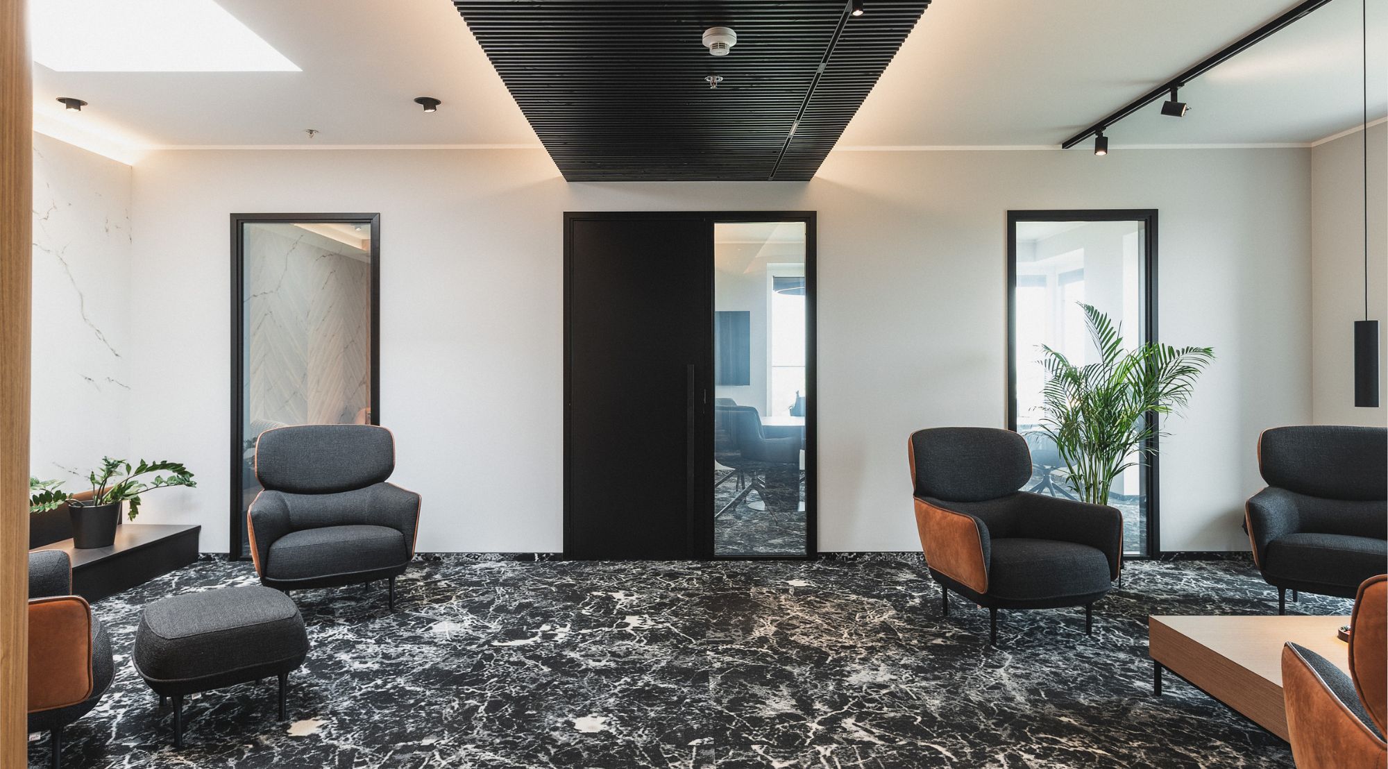 Projekti südameks sai idee ühendada soe puitmaterjalide elegants kaasaegse minimalismi ja tehniliste lahendustega. Ruumis domineerivad must marmor, tammelaudis ja rikkalikult tekstuurne kangas, mis loovad luksuslikku, kuid mitte ülespunutud atmosfääri. Avatud kontoriplaneering jagunes loomulikult erinevateks funktsionaalseks tsoonideks: töötsooni, kohtumisalasid ja esinduslikku vastuvõtukohta. Igal tsooni omab oma karakter, kuid kõik on ühendatud ühtse disainikeelega.