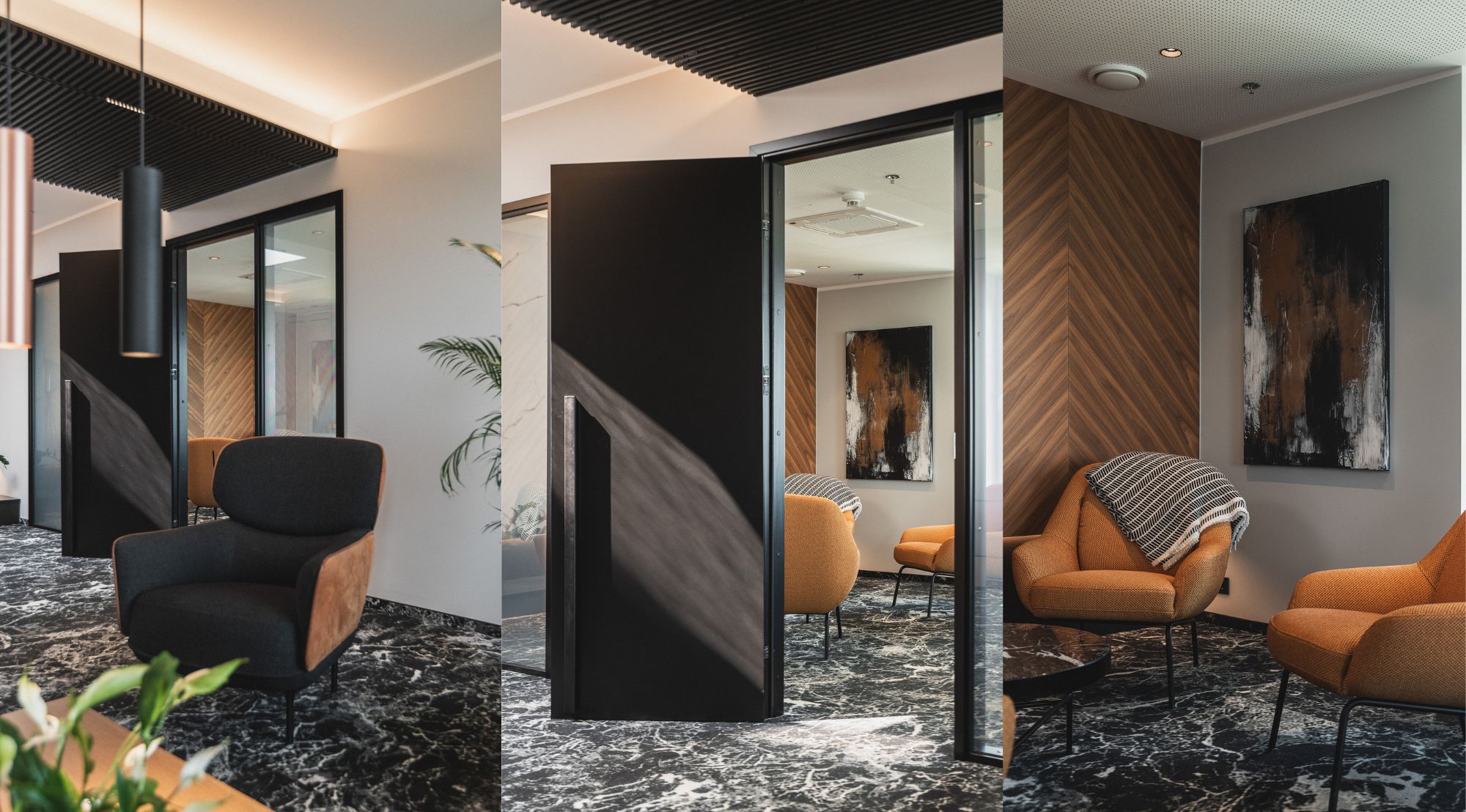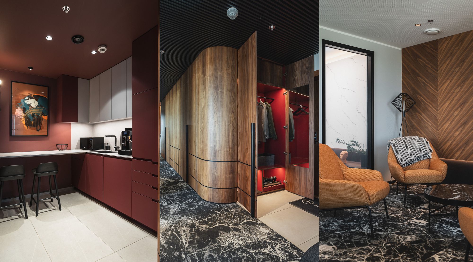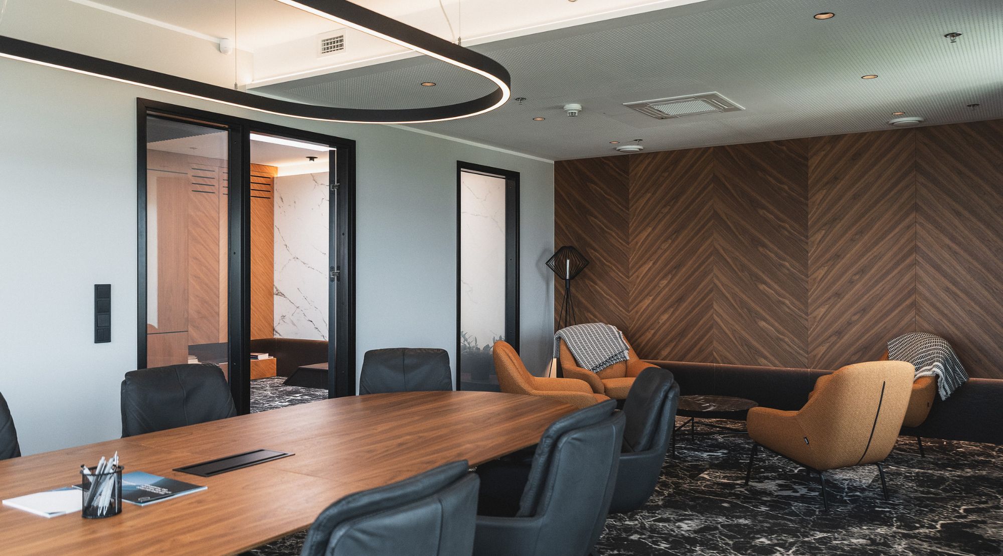 Projekti südameks sai idee ühendada soe puitmaterjalide elegants kaasaegse minimalismi ja tehniliste lahendustega. Ruumis domineerivad must marmor, tammelaudis ja rikkalikult tekstuurne kangas, mis loovad luksuslikku, kuid mitte ülespunutud atmosfääri. Avatud kontoriplaneering jagunes loomulikult erinevateks funktsionaalseks tsoonideks: töötsooni, kohtumisalasid ja esinduslikku vastuvõtukohta. Igal tsooni omab oma karakter, kuid kõik on ühendatud ühtse disainikeelega.
