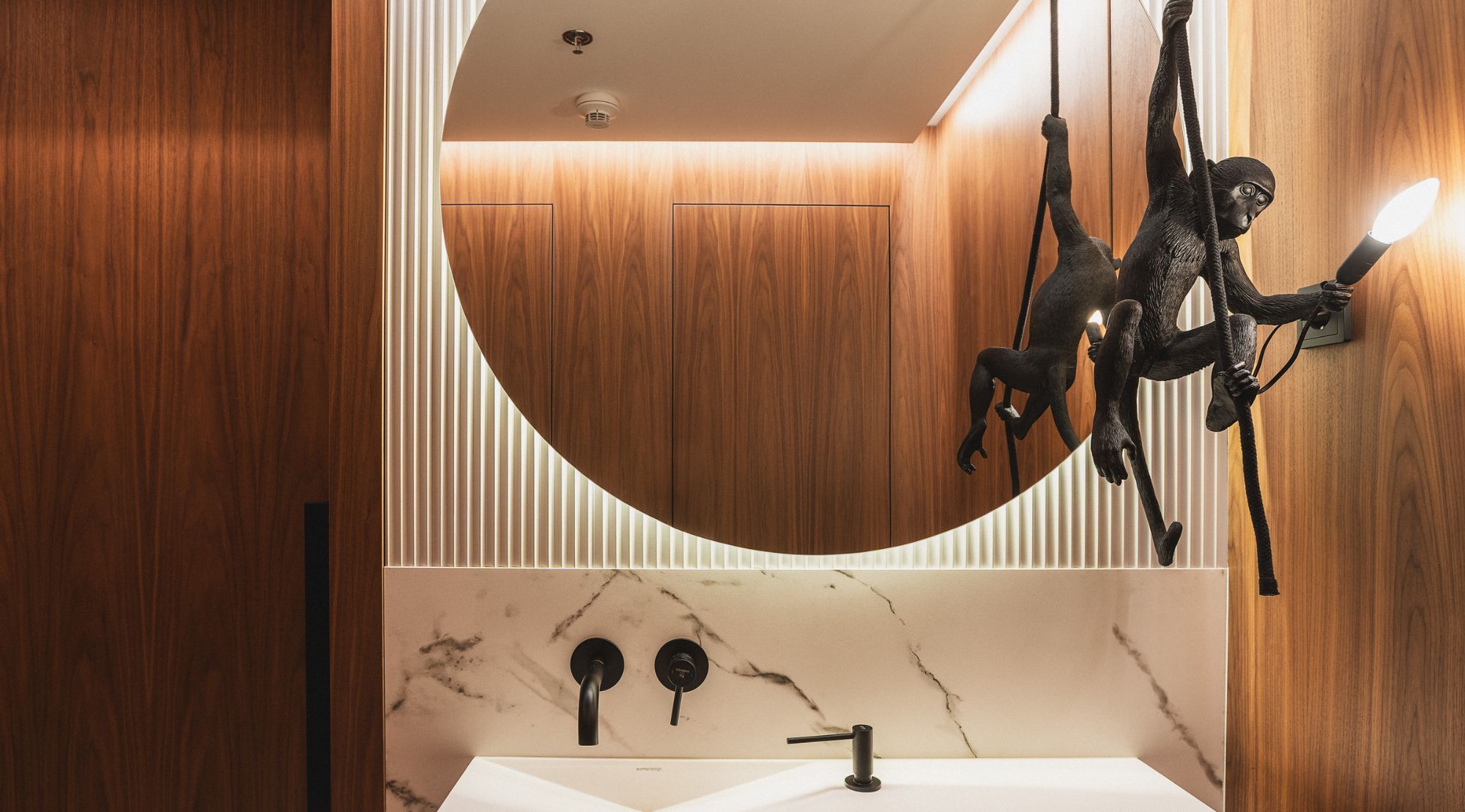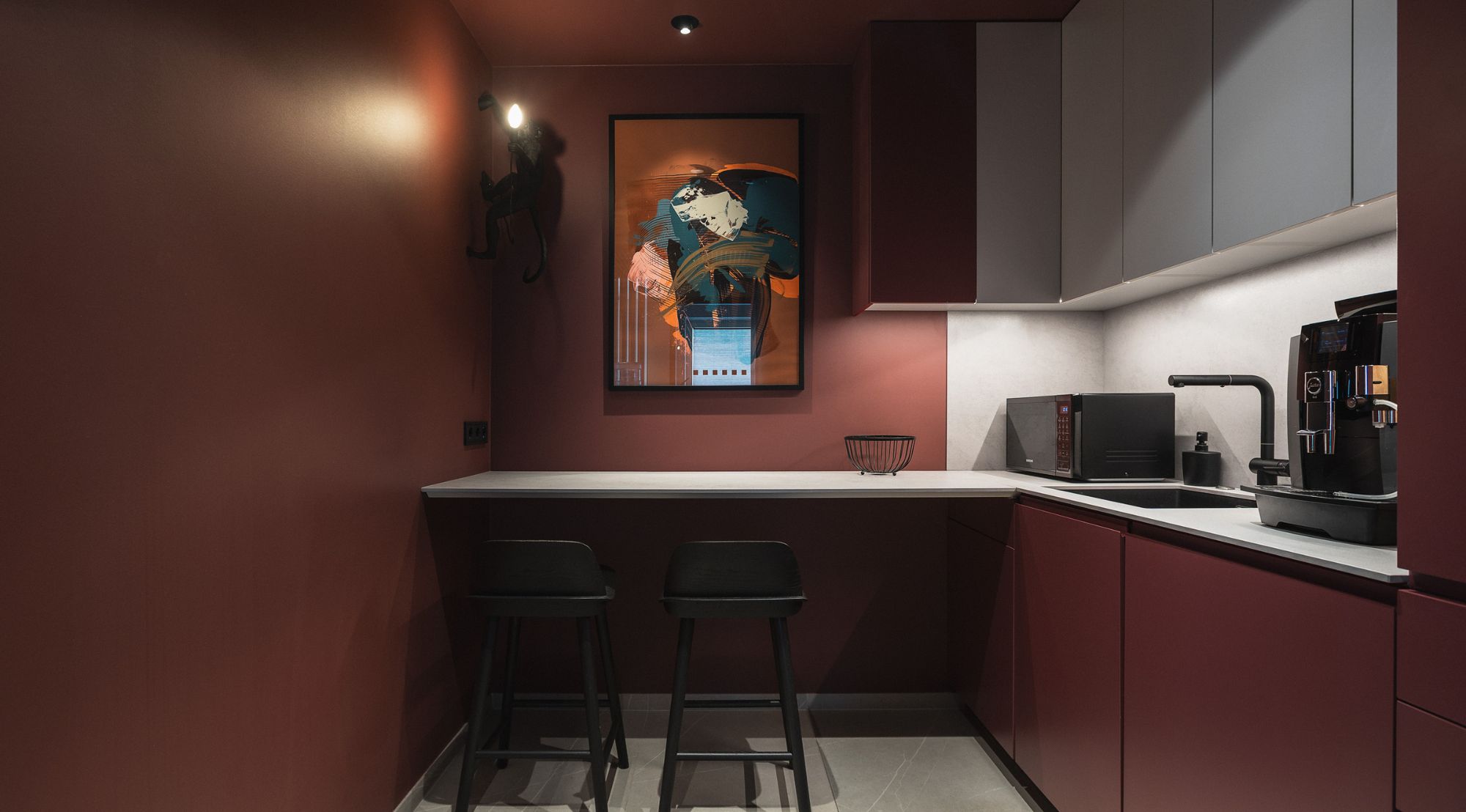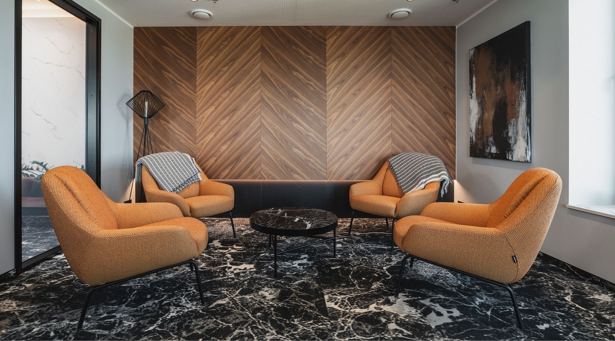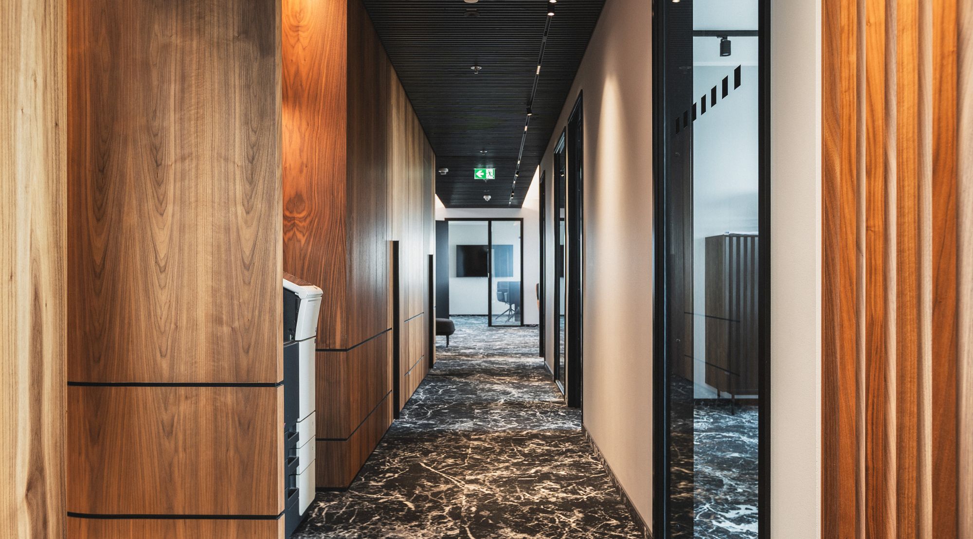 Projekti südameks sai idee ühendada soe puitmaterjalide elegants kaasaegse minimalismi ja tehniliste lahendustega. Ruumis domineerivad must marmor, tammelaudis ja rikkalikult tekstuurne kangas, mis loovad luksuslikku, kuid mitte ülespunutud atmosfääri. Avatud kontoriplaneering jagunes loomulikult erinevateks funktsionaalseks tsoonideks: töötsooni, kohtumisalasid ja esinduslikku vastuvõtukohta. Igal tsooni omab oma karakter, kuid kõik on ühendatud ühtse disainikeelega.