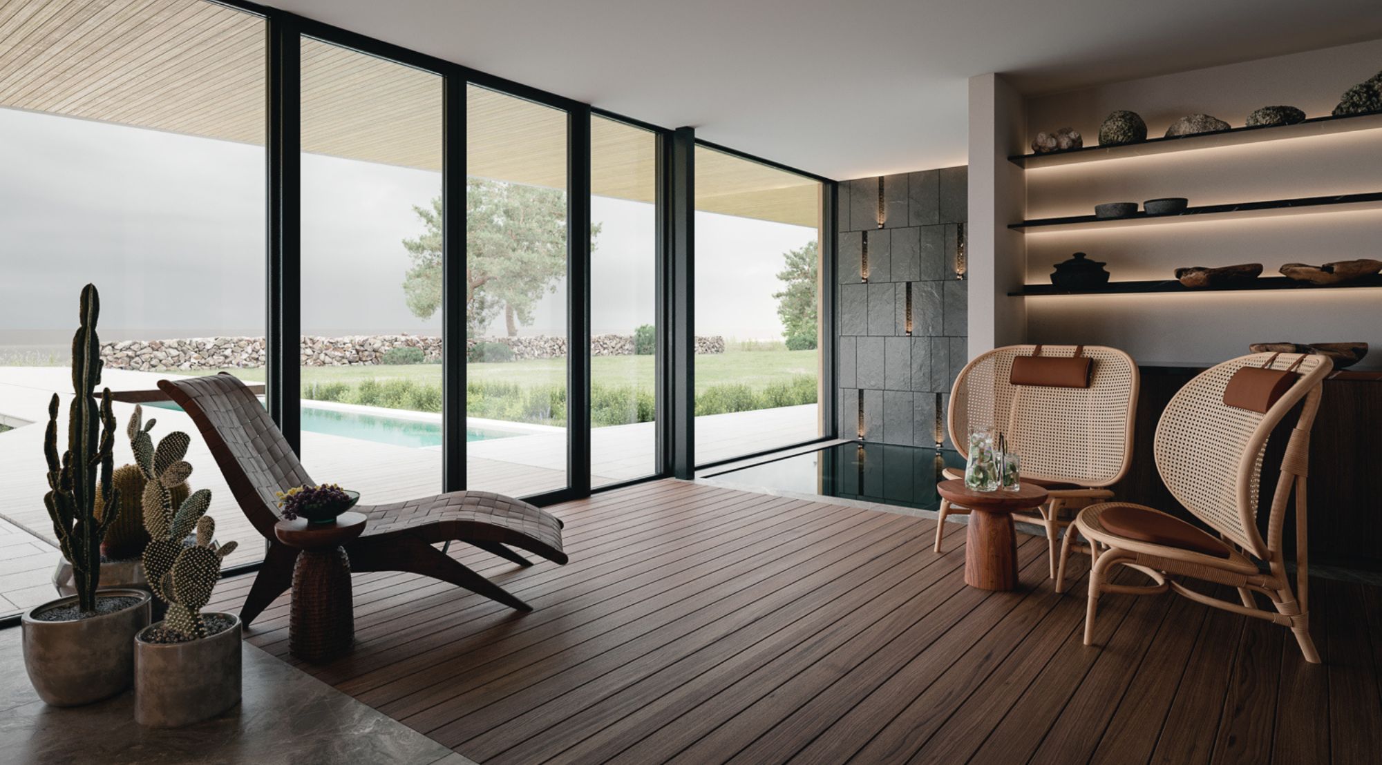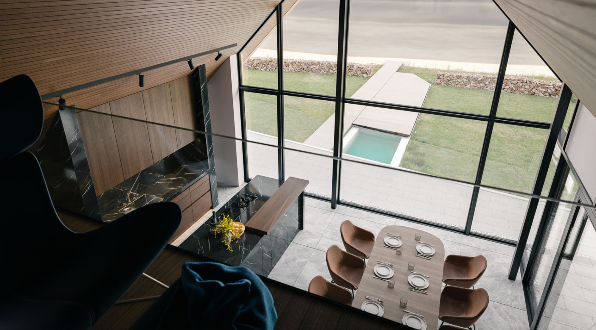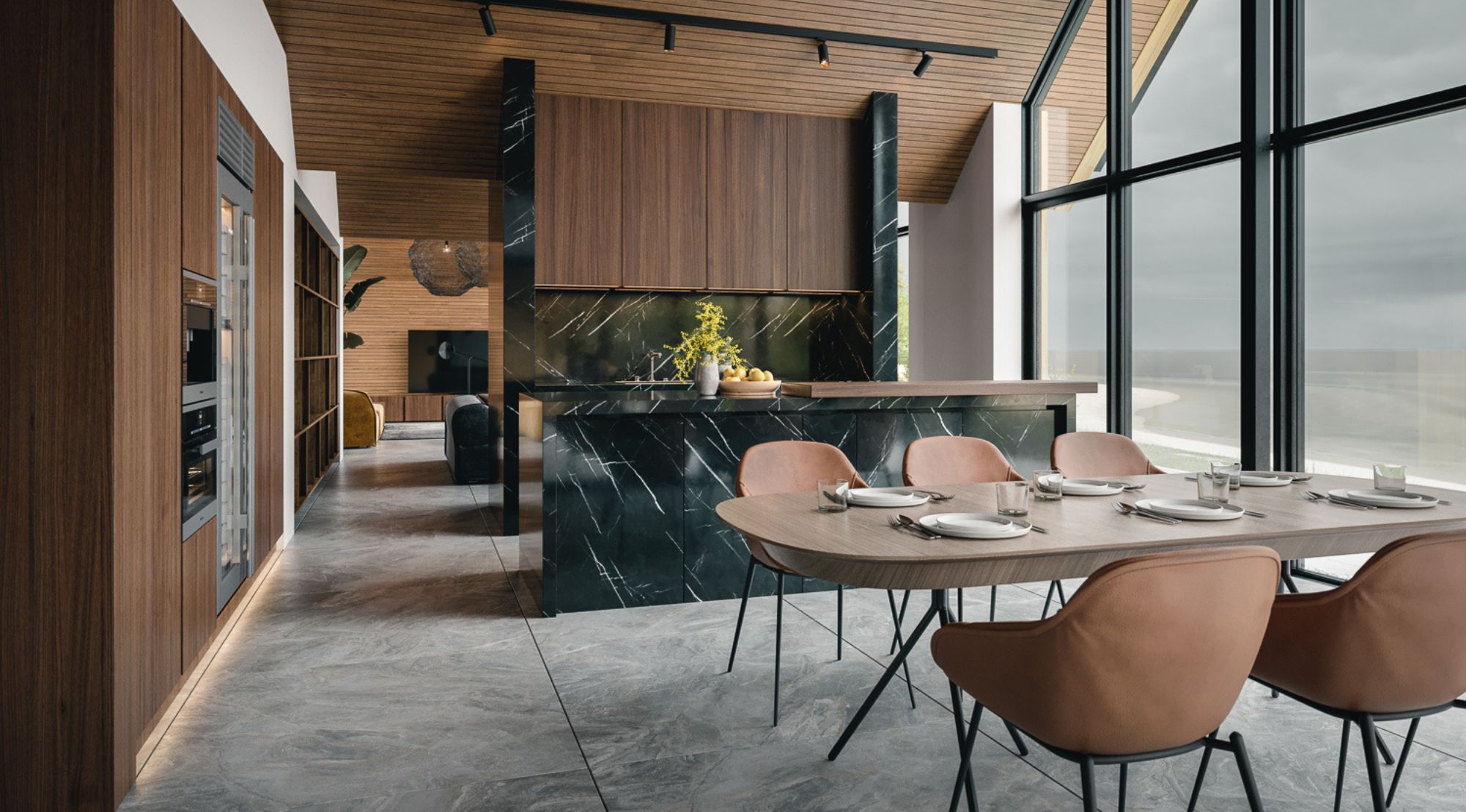 Sisemuses räägib iga detail mere lähedusest. Tumehall marmor meenutab merevaigustamist, naturaalse puu soojus tasakaalustab klaasi ja kivi jahedust, samas kui avatud planeering laseb merel vabalt sisse voolata. Tulemuseks on kodu, kus mere rütm saab igapäevase elu taktimõõduks – rahulik, kuid samas dünaamiline, ajatu, kuid elav.