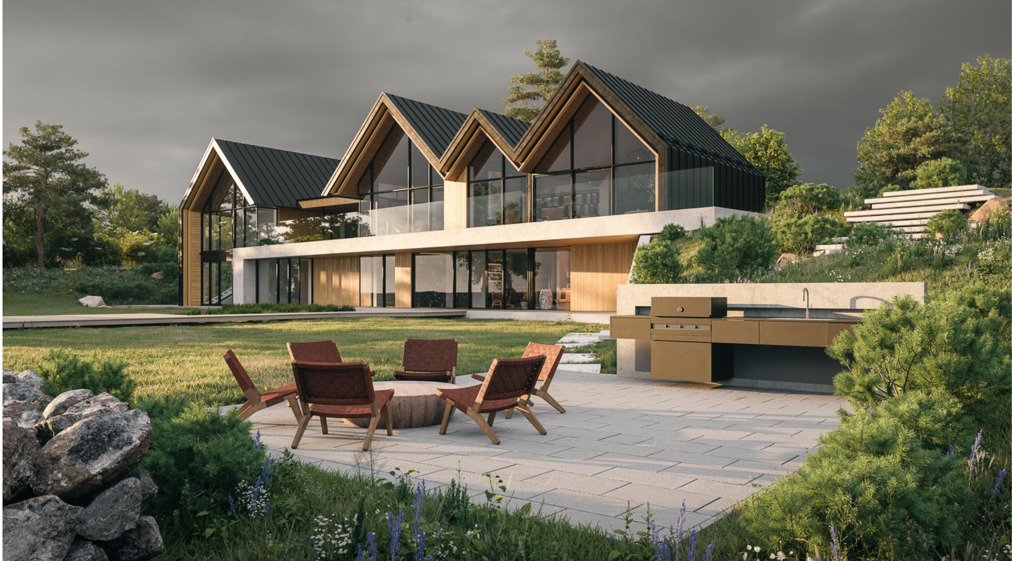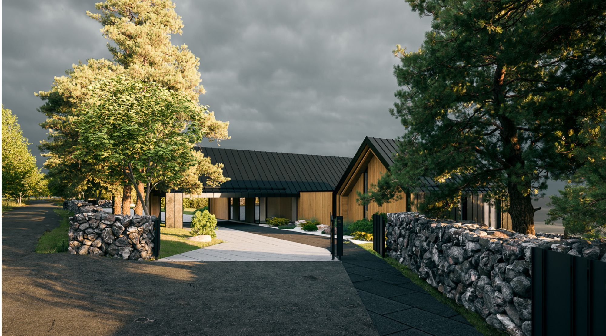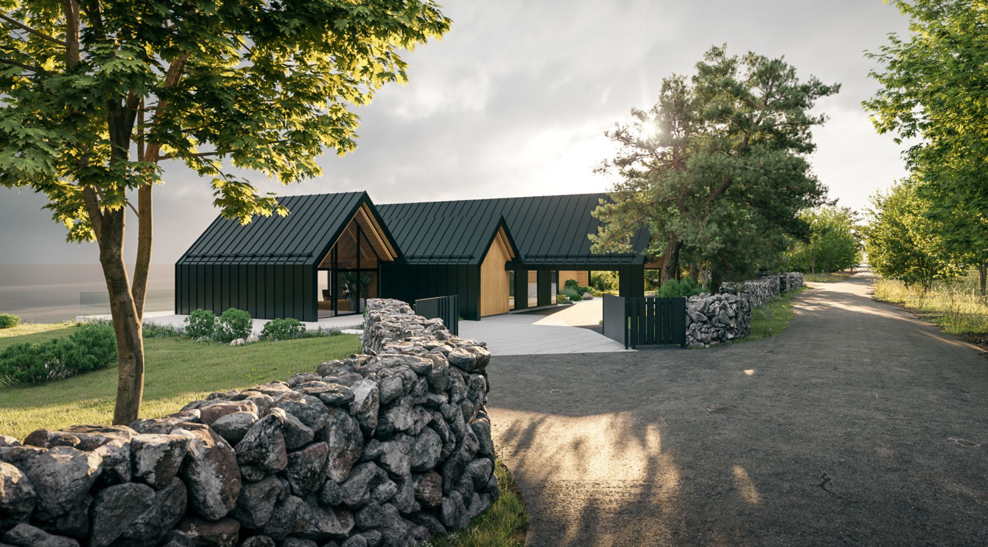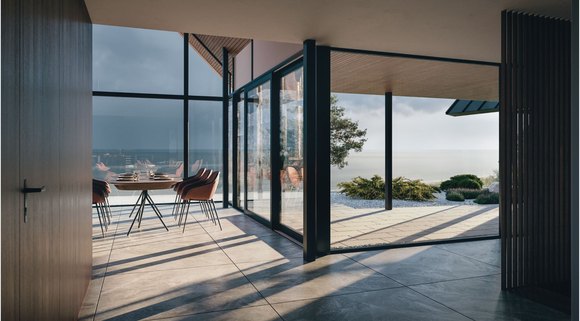 Meie lahendus tugines kontrastide harmooniale. Tume, ilmastikukindel väliskest kaitseb kodu mere tuulte eest, samal ajal kui soojad puiduaktsendid loovad kutsuva ja inimese elukeskkonna. Suurte klaaspindade kaudu toome mere otse tuppa – nii valguse kui ka pidevalt muutuva vaatepildina.