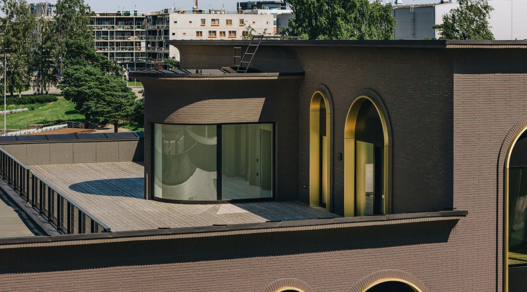 Fassaadikattematerjaliks on soojustusele kleebita mustjas-hall põletatud tellis Felhaus-Klinker. Akende ümber on eenduvad vormid, mis sama kiviga kaetud. Akende põsed on raamitud messinguga kaetud komposiitplaadist valtsitud raamidega.