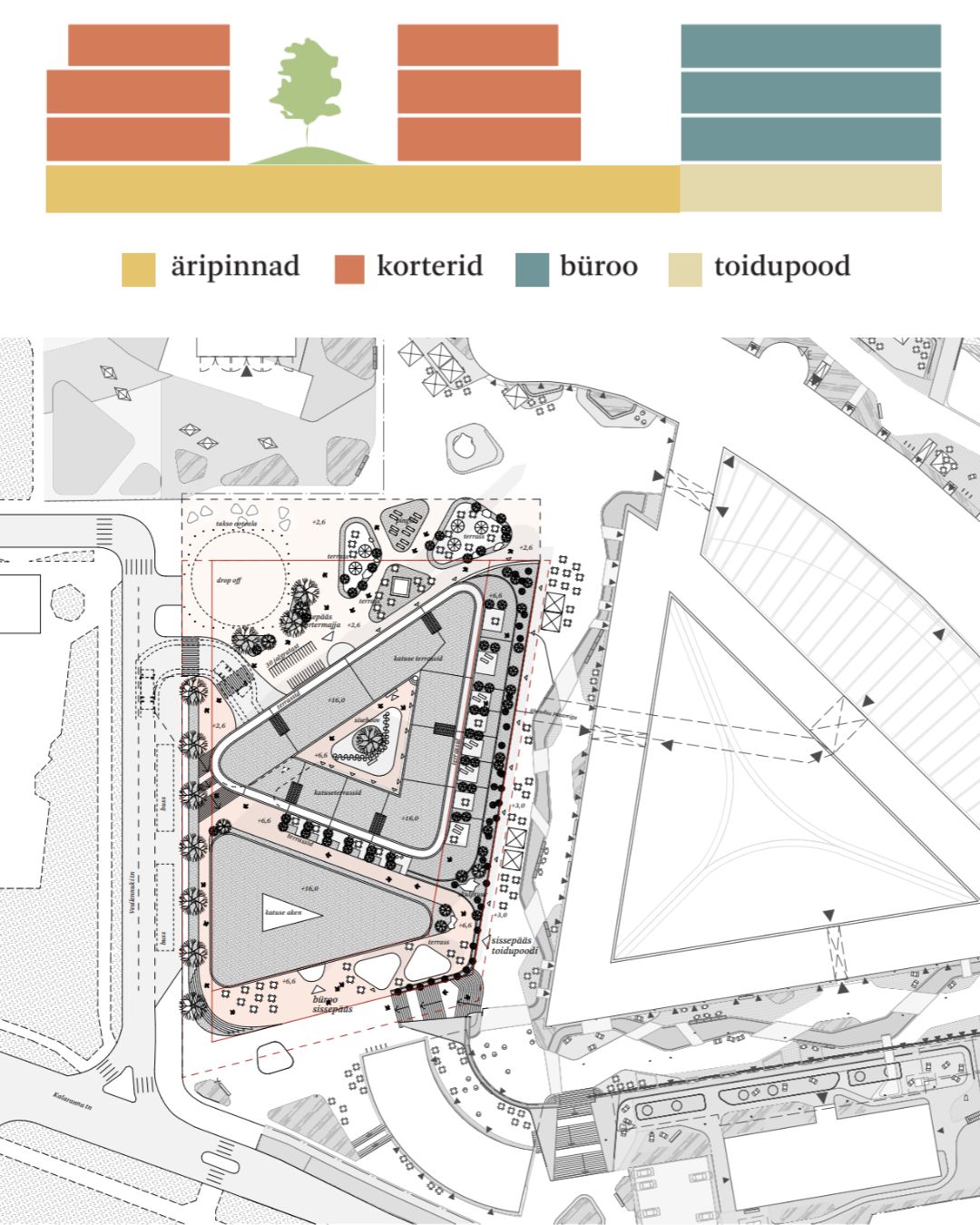 Kvartal koosneb kolmest erineva funktsiooniga hoonemahust: Kalaranna tänava poole suunatud büroohoone; mere ja korstna väljaku poole suunatud kortermaja ning vallikraavi ja korstnaväljaku poole suunatud poodium.